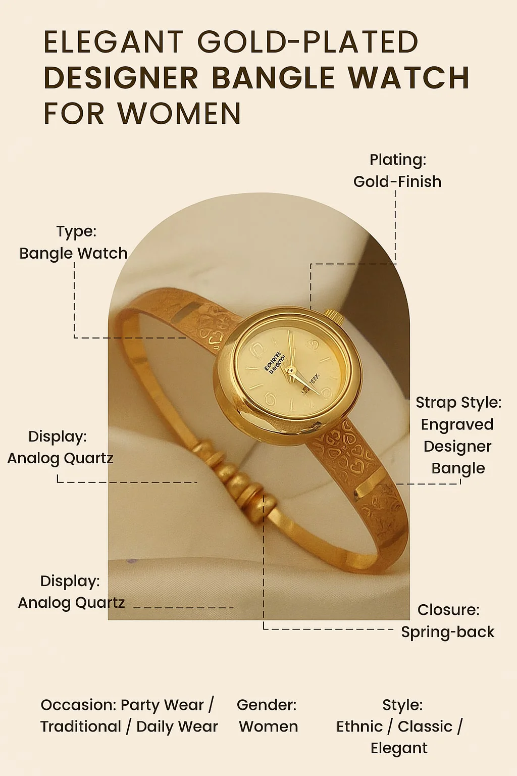 This elegant bracelet-style watch features a sleek white dial paired with a rich gold-plated finish, offering both style and functionality. The adjustable strap ensures a comfortable fit for all wrist sizes, making it perfect for daily wear as well as festive occasions. Designed to complement both ethnic and western outfits, it adds a touch of sophistication to any look. A timeless accessory that doubles as a beautiful piece of jewelry and a practical timepiece.